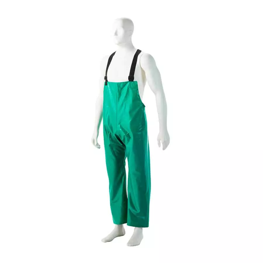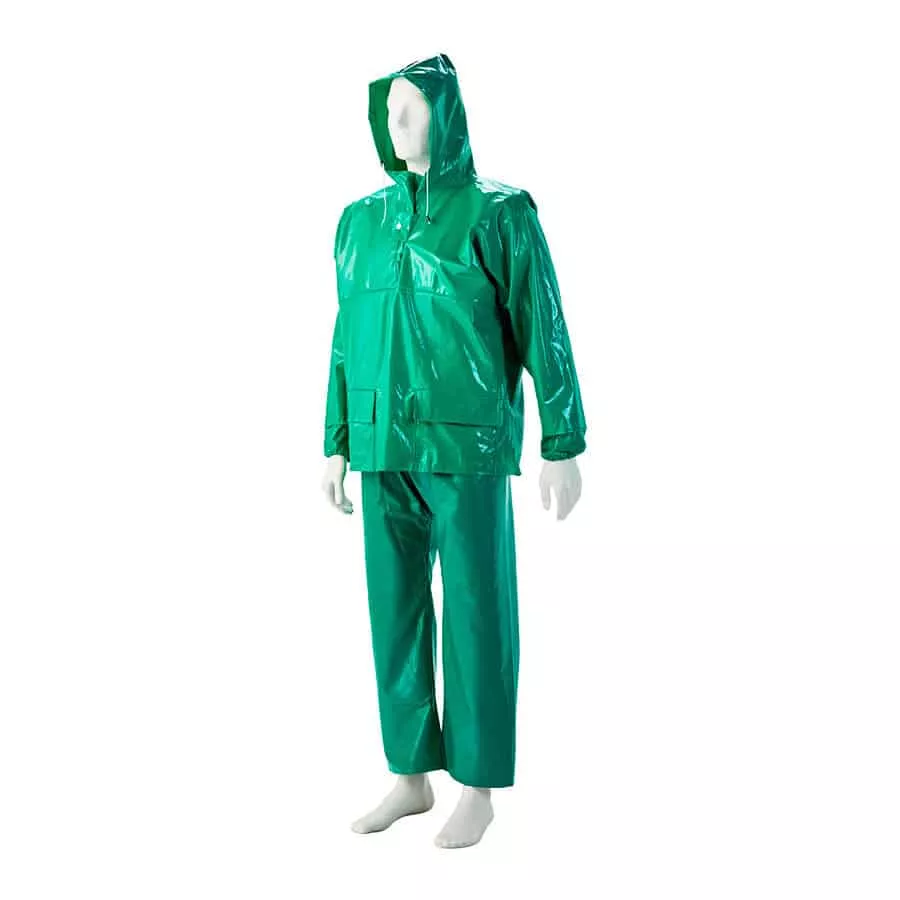 Dromex® JH-SM-G and BP-SM-G, PVC, heavy duty, storm protective attire, is a water-resistant jacket and bib pants suit, protecting the body and under- garments from the hazards of rain and water splashes.The jacket design consists of a fixed hood with drawstring, 2 pockets with storm flap, plastic double snap closure at the neck with an internal storm cuff that prevents water from running down your sleeve.The bib style trouser features a quality, adjustable webbing suspender with plastic buckle.